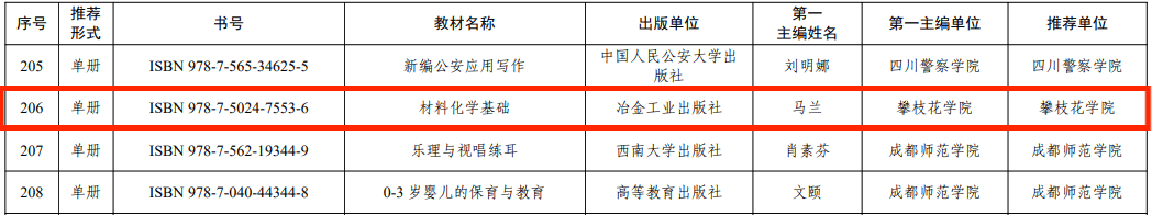近日,四川省教育厅公布了第一批四川省“十四五”普通高等教育本科规划教材书目(川教函[2024]496号),我校钒钛学院马兰教授及其教学团队编写的《材料化学基础》成功入选。