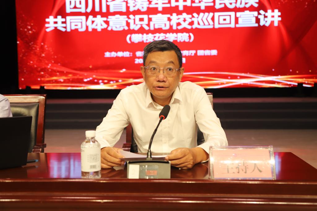 10月22日下午,由四川省民族宗教委、四川省教育厅、共青团四川省委主办的四川省铸牢中华民族共同体意识高校巡回宣讲在我校阳光会堂举行。四川省铸牢中华民族共同体意识高校巡回讲堂三年行动宣讲团成员、四川省民族研究所副所长陈东研究员作宣讲。校党委副书记刘立新主持并作总结讲话。